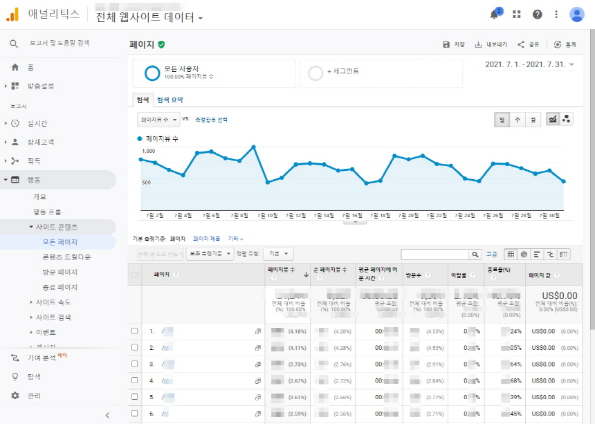 ■ 구글 애널리틱스(행동>사이트콘텐츠>모든 페이지)