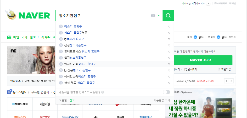 네이버에서 검색어를 입력하는 순간 자동으로 관련 검색어(이하 자동완성어라 함)가 여러 개 나온다.