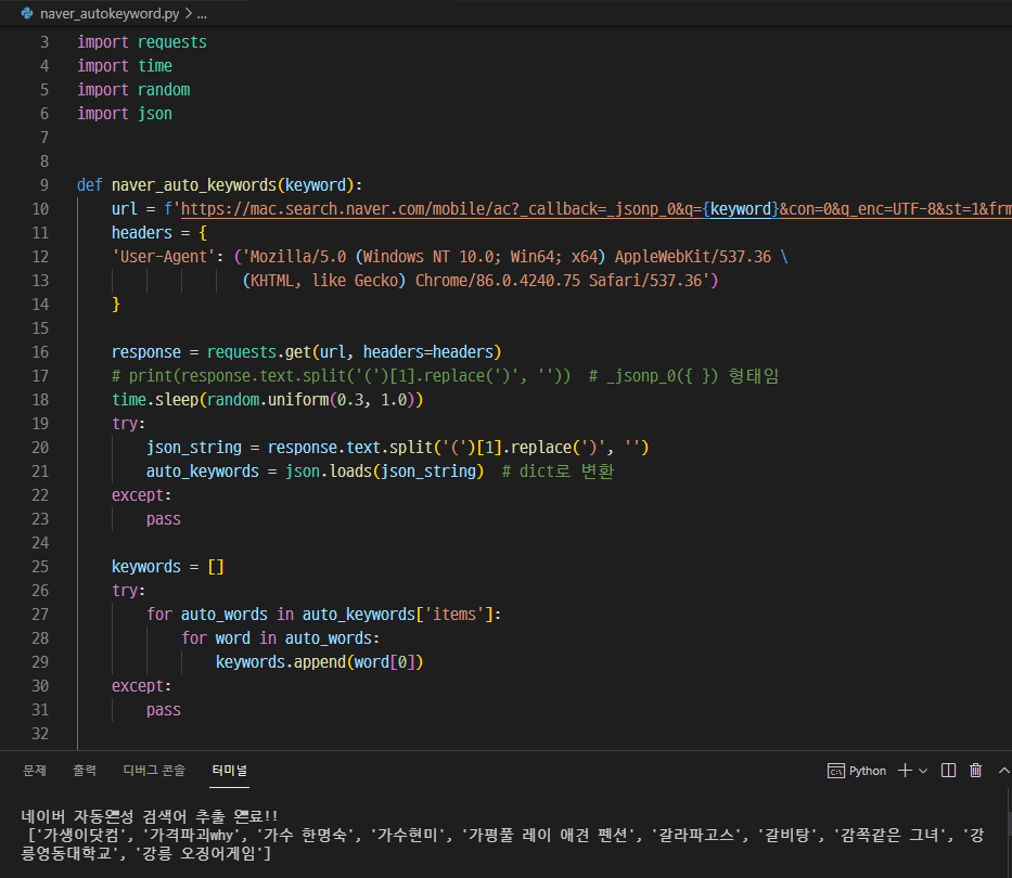 파이썬으로 만든 네이버 자동완성어 추출 미니 프로그램