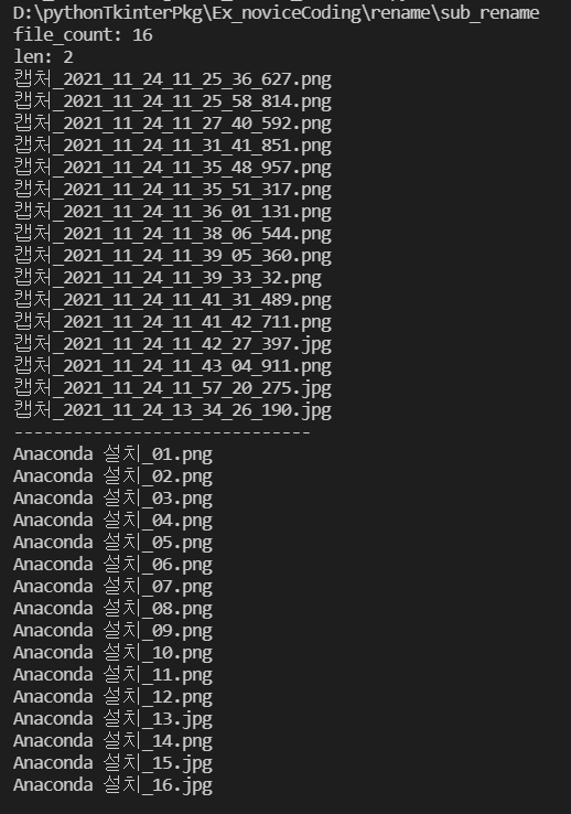 import pathlib ## 파일명 변경 함수 def rename_file(filepath, filenames): # path = pathlib.Path('.') / 'rename' # pathlib.Path('./rename')과 동일 path = pathlib.Path(filepath) print(path) # rename file_count = len([f for f in path.iterdir()]) # 폴더내 파일수 file_count_len = len(str(file_count)) print(f'file_count: {file_count}\nlen: {file_count_len}') cnt = 1 for file in path.iterdir(): if not file.is_dir(): # print(file) # rename\test10.png print(file.name) # test10.png # print(file.stem) # test10 # print(file.suffix) # .png # print(file.parent) # remame # print() directory = file.parent file_name_ext = file.name file_name = file.stem extension = file.suffix if file.is_file(): new_filename = filenames + str(cnt).zfill(file_count_len) + extension # 숫자 앞에 0 채우기 .zfill(숫자길이) file.rename(path / new_filename) cnt += 1 print('-' * 30) for f in path.iterdir(): print(f.name) file_dir = r'D:\rename\sub_rename' new_filename = 'Anaconda 설치_' rename_file(file_dir, new_filename)결과(터미널)