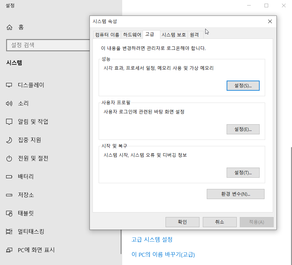 ☞ 시작>설정 클릭 후 좌측 하단의 "정보" 클릭한 후 "고급 시스템 설정"을 클릭하면 아래의 시스템 속성 창이 뜬다. (또는 시작 버튼 옆의 검색 버튼이나 Ctrl+q 누른 후 sysdm.cpl 입력, 엔터 하면 동일한 창이 뜸)