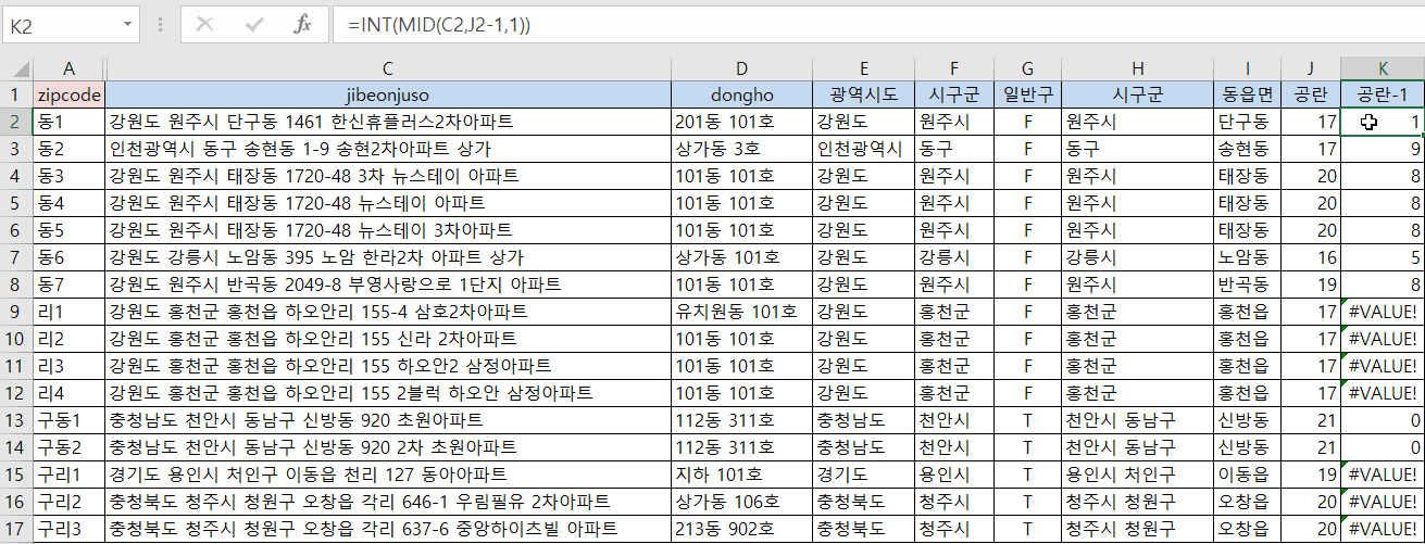 아파트 주소에서 엑셀 함수로 지역 명칭과 아파트명 분리해보기