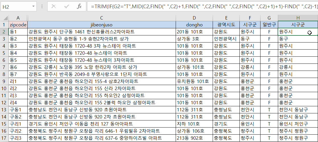 일반구 분리 - 앞의 시군구 분리할 때처럼 MID()와 FIND() 함수를 사용하되 IF 문으로 일반구인 경우와 아닌 경우를 판단하게 한다.