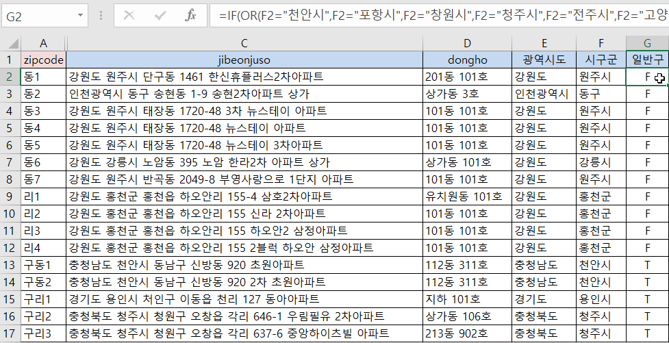 =IF(OR(F3="천안시",F3="포항시",F3="창원시",F3="청주시",F3="전주시",F3="고양시",F3="수원시",F3="용인시",F3="안산시",F3="안양시",F3="성남시",F3="부천시"),"T","F")