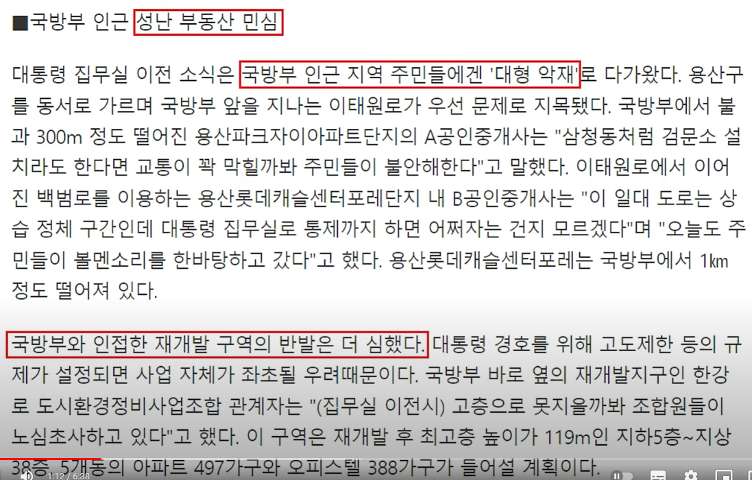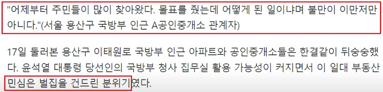 "윤석열 대통령 당선인님의 국민과 조금 더 소통하시고자 하는 그 마음은 충분히 이해되오나, 그것 때문에 한 국민의 소중한 일터가 사라지는 건 당선인님의 취지에 부합되지 않는다고 생각된다"용산 교통난 걱정에 뿔난 주민들 [관련 기사] "대통령 집무실 NO" 교통난 걱정에 뿔난 주민들 [현장르포] - 파이낸셜뉴스 (fnnews.com)