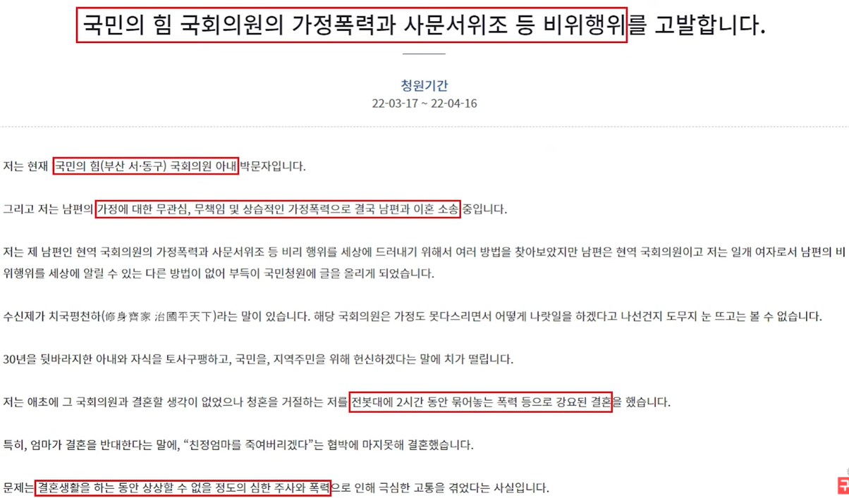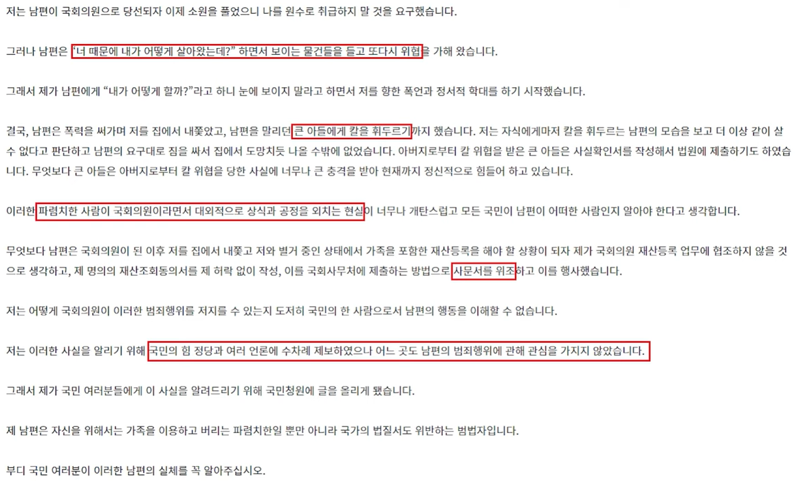 [관련 기사 : 굿모닝충청] “큰아들에게 칼 휘둘러..” 가정폭력 공개한 국회의원 아내 청원글 ‘화제’