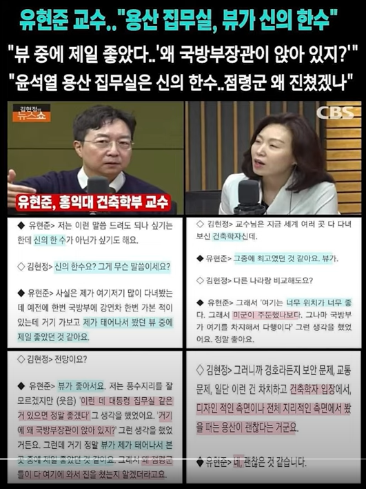 안보적으로, 국제적으로도 그렇잖아요. 우리 북한하고 관계에서도 그렇고. 그런데 느닷없이 국방부를 다른 데로 가라, 지금 이 위중한 시기에 그것도 우선 말이 안 되는 거고. 두 번째는 용산이라고 하는 데는 어떤 교수가 자리 건너 좋다, 위치가 너무 좋고.