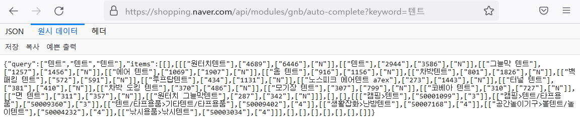 마우스 우클릭하여 새 텝에서 열면 URL이 "https://shopping.naver.com/api/modules/gnb/auto-complete?keyword=테"로 표시된다. 이 URL에서 "keyword=테"를 텐트로 하면 아래 이미지처럼 텐트 검색어에 대한 네이버쇼핑 자동완성어가 보인다.